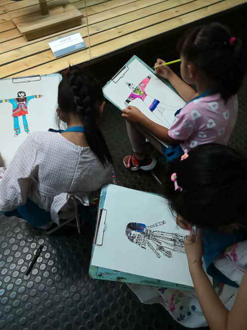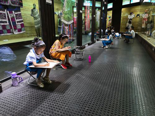 6月22日、23日來自彩墨書畫教育的60餘位小(xiǎo)同學(xué)們,在老師和家長(cháng)的帶領下來到了雲南民(mín)族博物(wù)館進行寫生活動。小(xiǎo)朋友們首先參觀了我館基本陳列,然後選定了民(mín)族服飾與制作(zuò)工(gōng)藝展廳、民(mín)族民(mín)間面具(jù)展廳作(zuò)為(wèi)參照對象進行寫生。